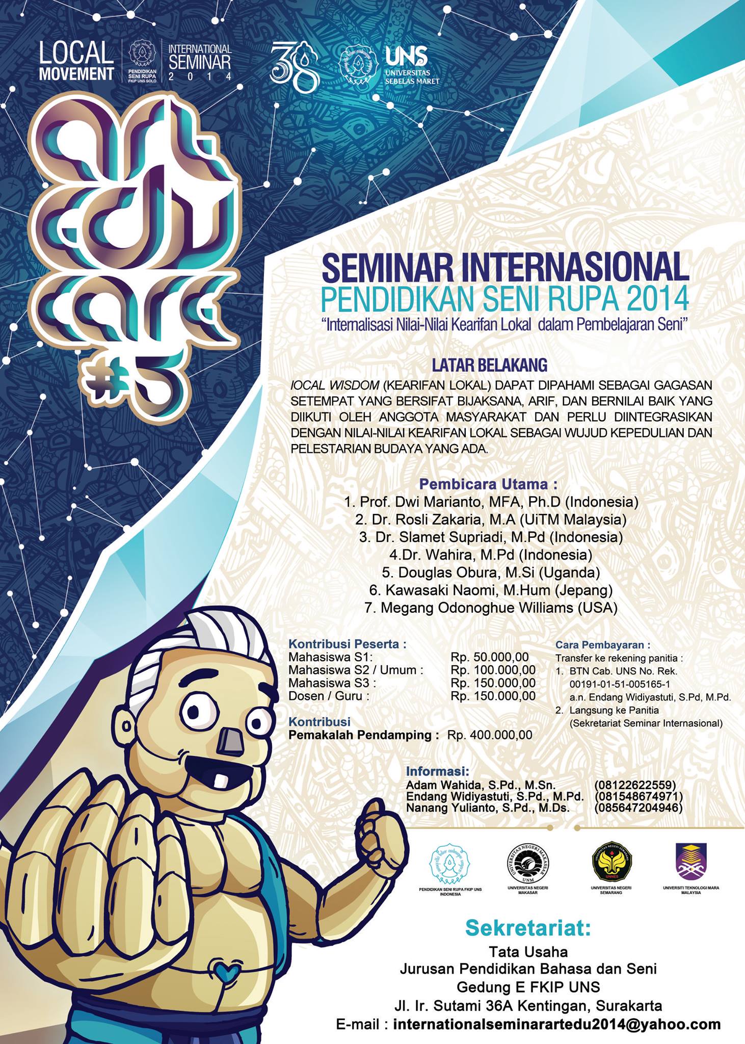 Mengiringi keseluruhan rangkaian kegiatan, tahun ini digelar seminar Internasional Pendidikan Seni Rupa dengan tema “Internasional Nilai-nilai Kearifan Lokal dalam Pembelajaran Seni”. Dilangsungkan di Gedung F FKIP UNS, pembicara yang dihadirkan tahun ini adlah; Prof. M. Dwi Marianto M.FA, PhD, (Indonesia) , Dr. Rosli Zakaria , M.A. (UiTm Malaysia), Dr. Slamet Supriyadi, M.Pd. (Indonesia), Dougls Obura, M.Si (Uganda), Kawasaki Naomi, M.Hum.